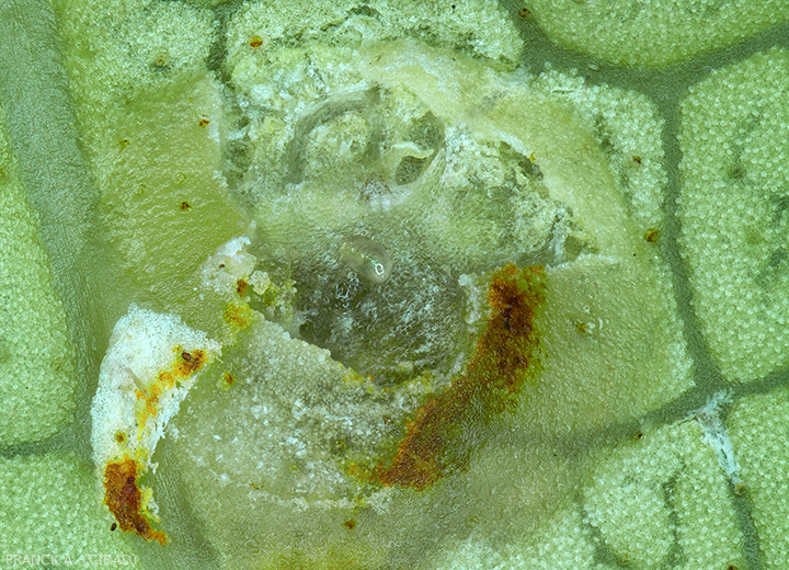 • parasitée par une micro-guêpe de la famille des Eulophidae (Chrysonotomia pulcherrima).