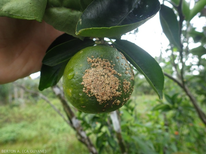 - Fruits : pustules liégeuses irrégulières (voir photo 2). Infectés aux premiers stades de leur développement, les fruits se déforment et sont sujets à une chute prématurée. Les fruits infectés ne peuvent pas être commercialisés.