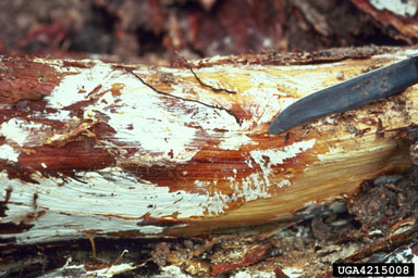 À partir du site d'infection, le champignon envahit les racines latérales et la région du collet, où il se propage sous forme de mycellium blanc dans la région du cambium entre l'écorce et le bois.