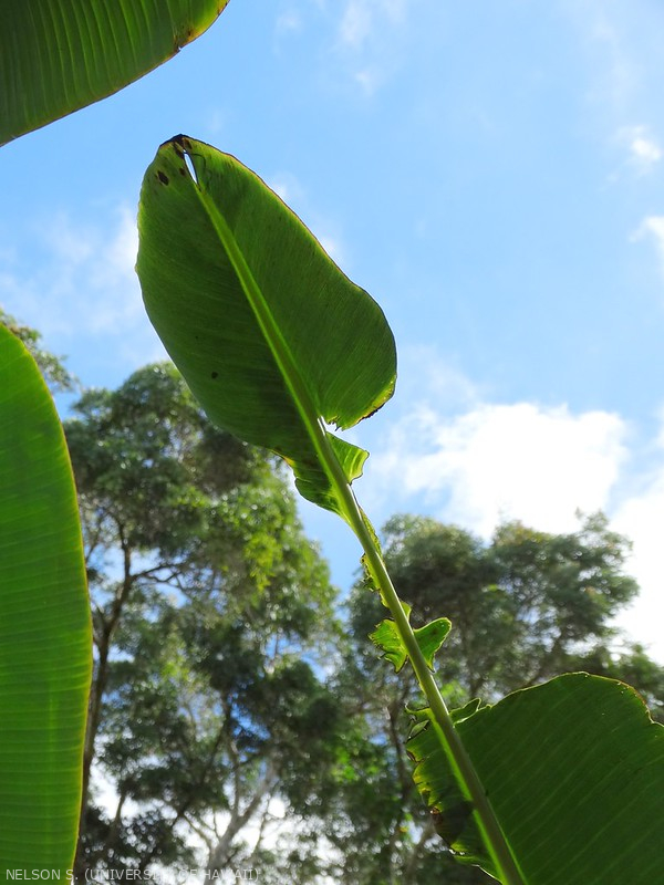 Feuilles : nécroses en bordure sans jaunissement préalable. Feuillage vert foncé tirant vers le bleu ou le bronze. Pseudo-tronc : : aspect fripé, des rejets au stade feuilles lancéolées. |