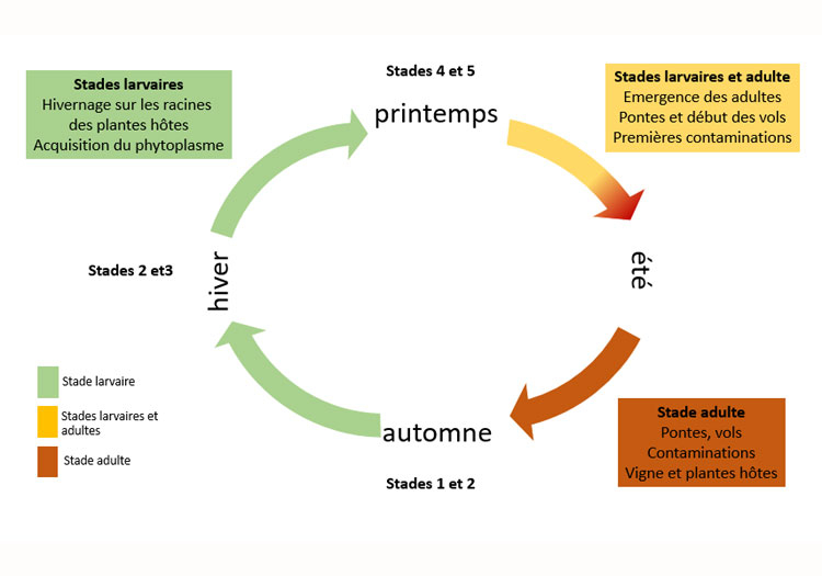 L'adulte émerge sous terre puis sort pour atteindre le collet des plantes. La maturité sexuelle est obtenue en moins de 10 jours. Une fois fécondée, la femelle se tient au collet des plantes pour y déposer ses oeufs. Après éclosion des oeufs, les larves L1 migrent dans le sol vers les racines.
