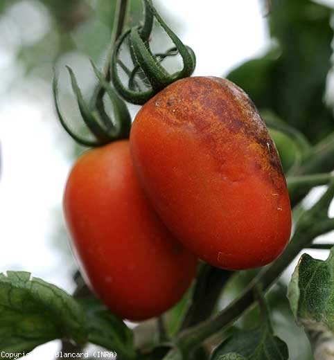 Les fruits atteints à un stade précoce présentent des marbrures brunes très caractéristiques (figures 10 à 13). Ils sont souvent bosselés. Dans ce cas, l'extension des marbrures est plutôt lente et leur marge irrégulière. Si les attaques surviennent plus tardivement, les plages marbrées sont plus homogènes et souvent réparties en cercles concentriques festonnés. Elles peuvent prêter à confusion avec celles occasionnées par d'autres Phytophthora, en particulier P. nicotianae.