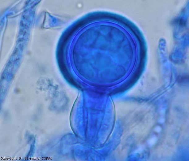 - par l'intermédiaire d'oospores issues de la reproduction sexuée ; celles-ci se forment dans les tissus malades nécrosés et se retrouvent ultérieurement dans le sol, en même temps que les débris végétaux (figures 1 et 2). Comme nous l'avons précisé précédemment, depuis maintenant plus d'une dizaine d'années, de nouvelles souches des deux types sexuels A1 et A2 sont détectés assez couramment dans plusieurs pays d'Amérique du Nord et d'Europe, comme en France sur pomme de terre et tomate. Le type A2 est bien représenté sur cette dernière plante, plus que sur pomme de terre. Ainsi, P. infestans doit pouvoir maintenant accomplir son cycle sexuel complet sur tomate et former des oospores capables de se conserver dans le sol plusieurs mois, voire plusieurs années. Notons que ces organes de conservation peuvent être observés sur les folioles, les fruits, et ponctuellement sur les semences. De plus, cette reproduction sexuée peut être à l'origine de nouveaux génotypes possédant des propriétés biologiques nouvelles pouvant remettre en cause l'efficacité des luttes, notamment chimiques et génétiques ;
