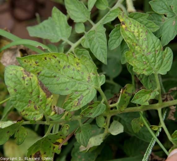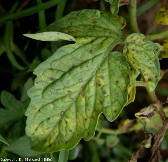 De minuscules taches brunâtres, légèrement angulaires, parfois discrètement auréolées d'un liseré chlorotique, peuvent être observées sur toutes les folioles de la tomate (figures 1 et 4). Leur taille est souvent limitée à quelques millimètres, excepté lors de conditions particulièrement humides qui favorisent leur extension et leur confluence. Dans ce cas, elles peuvent occuper de larges portions du limbe. Généralement, les taches s'éclaircissent progressivement et finissent par prendre une teinte grisâtre au fur et à mesure qu'elles se nécrosent et se dessèchent. Des fructifications de Stemphylium spp. (des masses brunes correspondant aux conidies mûriformes) sont visibles à la loupe binoculaire sur les 2 faces du limbe. Les tissus lésés, d'aspect terne, se fendent parfois (figures 3 et 4). Lors d'attaques particulièrement sévères, la forte densité des taches, leur extension accrue et leur confluence induisent des mortalités foliaires importantes, précédées de jaunissement (figure 5), et de chutes de feuilles plus ou moins conséquentes.