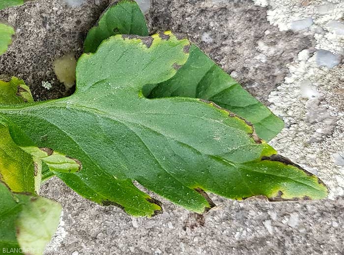 Les symptômes sur folioles de cette bactériose aérienne sont assez comparables à ceux décrits pour les Xanthomonas spp. : des petites taches graisseuses, sombres, prenant rapidement une teinte brune à noire, apparaissent au hasard sur les folioles, souvent les plus jeunes ou en bordure du limbe (figure 1). Ces lésions sont circulaires ou légèrement angulaires et présentent un halo jaune plus ou moins large et marqué (figure 2). D'un diamètre de l'ordre 2 à 3 mm, elles peuvent s'étendre et confluer en présence d'humidité, altérant de larges secteurs du limbe qui finissent par se nécroser et se dessécher. Des feuilles fortement affectées peuvent jaunir et se dessécher entièrement.
