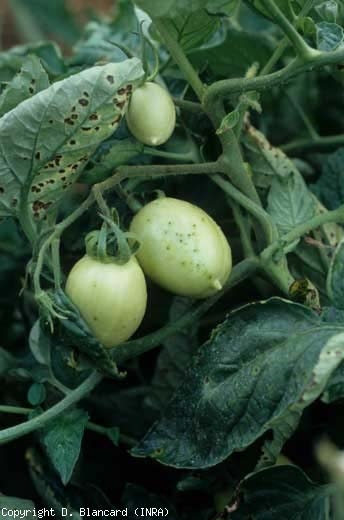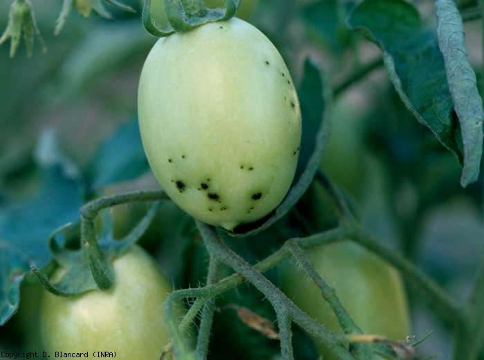 Seuls les symptômes sur fruits permettent de différencier la moucheture de la gale bactérienne : Pseudomonas syringae pv. tomato est à l'origine de minuscules taches noires, essentiellement sur les fruits verts (figures 5 à 7). Celles-ci sont très superficielles, légèrement en relief et ont un diamètre de l'ordre du millimètre (moins de 3 mm au maximum). Un halo humide, vert sombre, les entoure parfois. Ces mouchetures noires persistent sur les fruits matures rouges.