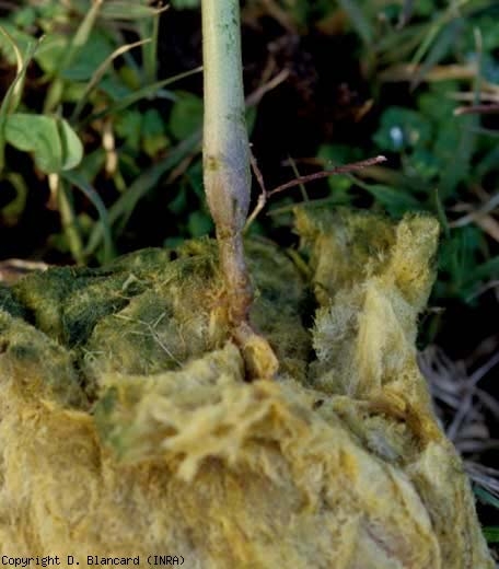 - des altérations humides et molles apparaissant sur le collet et pouvant s'étendre sur quelques centimètres. Dans ce cas, celui-ci donne l'impression d'avoir été plus ou moins pincé. Les tissus touchés brunissent progressivement.