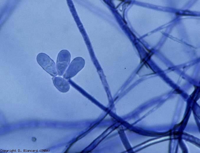 Ce champignon est à l'origine de lésions sombres, marbrées de veines brunes, qui apparaissent près de la cicatrice pédonculaire des fruits (figures 1). Celle-ci, en plus d'être auréolée d'une zone brune, se couvre d'une moisissure rose pâle. Cette moisissure est constituée des longs conidiophores arbusculeux du champignon portant des conidies bicellulaires, lisses et hyalines, allongées ou pyriformes (figures 2 et 3). D'une manière générale, les fruits affectés peuvent tomber prématurément. Trichothecium roseum peut synthétiser une mycotoxine dans les tissus altérés : le trichothécène.