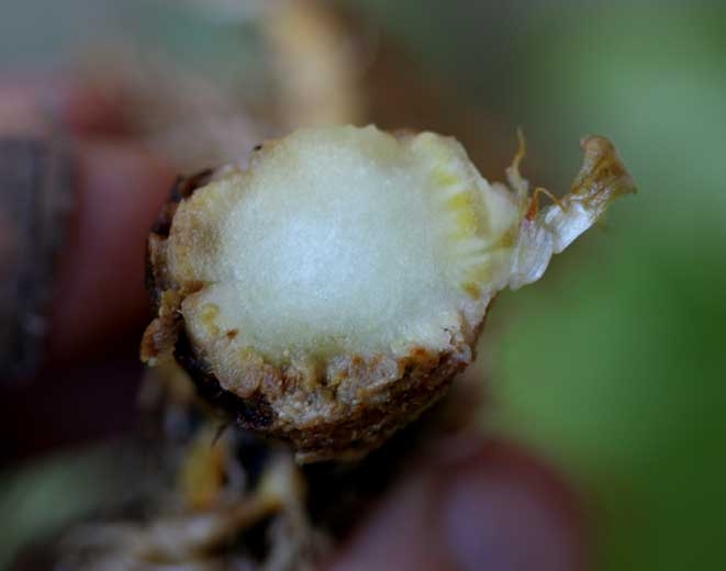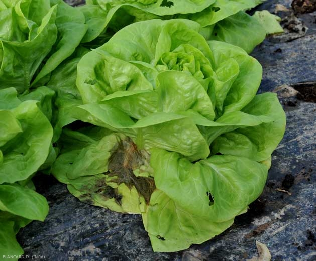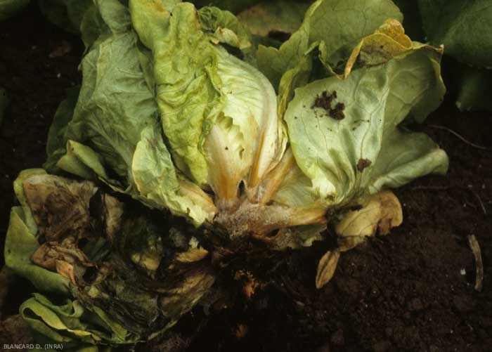 En cours de culture et à l'approche de la récolte, ses attaques peuvent se matérialiser par de brusques flétrissements de plantes (figure 1), isolées ou en foyers, consécutifs à une altération du système vasculaire. Comme nous l'avons dit précédemment, il affectionne les vieilles feuilles sénescentes qui se trouvent sous le couvert végétal (figures 2 et 3) et en contact avec le sol après la pommaison. Il les envahit rapidement, produisant une pourriture humide, marron à brune. Cette pourriture gagne les autres feuilles saines contiguës et le collet (figure 4) qui est altéré plus ou moins profondément. Les vaisseaux sont ainsi touchés (figure 5) et les plantes peuvent flétrir et/ou dépérir progressivement ou brutalement en fonction des conditions climatiques (figures 6 à 8).