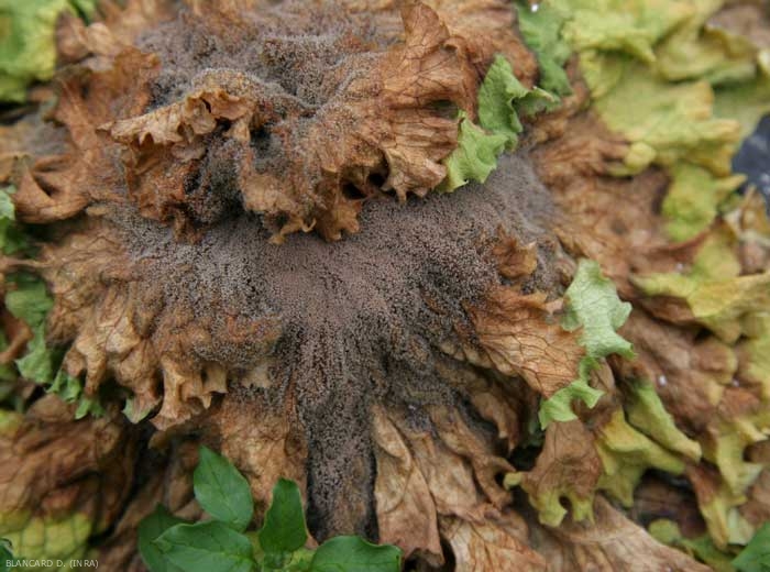Quelles que soient les parties des salades touchées, les tissus affectés se couvrent d'une moisissure grise (figures 14 et 15) très caractéristique constituée des conidiophores et des conidies du champignon. Des sclérotes noirs (2 à 5 mm de diamètre) (figure 16) sont de temps en temps visibles sur les mêmes tissus. On observe parfois la formation d'un mycélium cotonneux blanc sale pouvant être confondu avec celui des Sclerotinia spp.