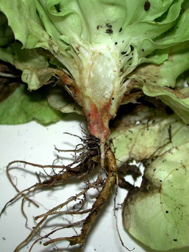 Les plantes adultes affectées montrent des symptômes racinaires et vasculaires comparables à ceux observés sur les plantules. Une coupe longitudinale révèle des vaisseaux de couleur brune (figures 2 à 4). En conséquence, des feuilles situées sur un côté des salades jaunissent et se nécrosent en périphérie du limbe.