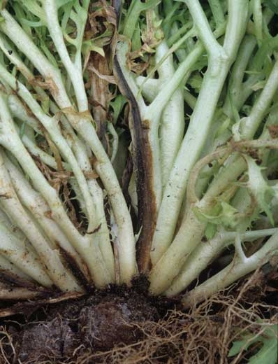 Sur chicorées scarole ou frisée, on retrouve à peu près les mêmes symptômes. Les lésions sont plus brunes à noires (figure 5). De plus, Thanatephorus cucumeris donne l'impression d'épargner momentanément la nervure principale (figure 6).
