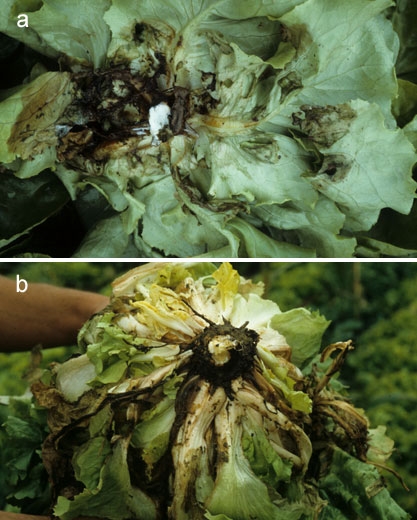 Sur laitue, on constate d'abord des lésions assez localisées, plus ou moins nombreuses, sur le limbe et la nervure principale des feuilles basses au contact du sol (figures 1 et 2). Elles sont initialement de consistance sèche et ont une teinte rouille à brun foncé. Elles évoluent plus ou moins rapidement en fonction des conditions climatiques. Leur extension conduit parfois à la formation de taches chancreuses concaves sur la nervure principale (figure 3). Une pourriture assez humide ne tarde pas à s'installer sur les nervures principales de plusieurs feuilles ainsi que sur le limbe à proximité. Elle gagne progressivement le pivot via la zone d'insertion des feuilles. A terme, les premières feuilles touchées, les plus externes, flétrissent. Leur limbe ne tarde pas à se dégrader sous l'action conjuguée de Thanatephorus cucumeris mais également de bactéries secondaires qui amplifient la pourriture initiée (figure 4). Botrytis cinerea peut lui aussi coloniser secondairement les tissus altérés.