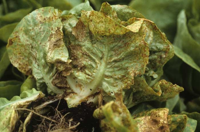 Comme vous pouvez le constater sur les figures 1 et 2, la maladie des anneaux nécrotiques de la salade et l'anthracnose, respectivement provoquées par l'agent des anneaux nécrotiques de la laitue (LRNA) et Microdochium panattonianum, sont à l'origine de taches et de nécroses qui couvrent parfois de larges secteurs sur les feuilles basses des salades. Leurs symptômes peuvent parfois prêter à confusion avec ceux engendrés par les agents pathogènes traités dans cette rubrique. Il en est de même pour Pectobacterium carotovorum subsp. carotovorum (figure 3) dont la pourriture interne de la tige des salades peut gagner les nervures des feuilles basses et déborder sur le limbe environnant, contribuant ainsi à quelques confusions.