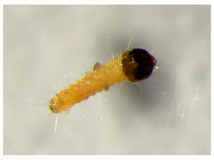 - La chenille présente un stade errant, dit « stade baladeur » de moins de 24 h après lequel elle perfore un bouton floral puis les voisins qu'elle agglomère par le tissage d'un fil soyeux pour former le « glomérule ». Cette sorte de nid grossira au fur et à mesure du grossissement de la chenille qui passera par cinq stades larvaires successifs protégée à l'intérieur du glomérule. Le terme de son développement correspond en général au stade fin floraison. La chenille sort alors de son glomérule et tisse son cocon de nymphose à proximité dans l'inflorescence ou sur le bord d'une feuille. La nymphose dure de dix à quinze jours.