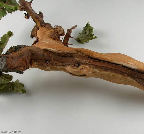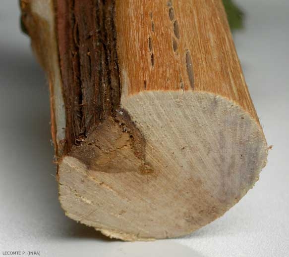 Des lésions longitudinales et sectorielles, s'initiant ou non à partir de blessures (plaies de taille, craquelures, plaies d'épamprage, désordres vasculaires liés à l'esca...), sont visibles dans le bois (figures 1 à 4). Ajoutons que certaines de ces lésions ressemblent à celles occasionnées par l'eutypiose (figures 2 et 3), mais sans que des symptômes de pousses rabougries en zig zag soient présentes sur les rameaux.