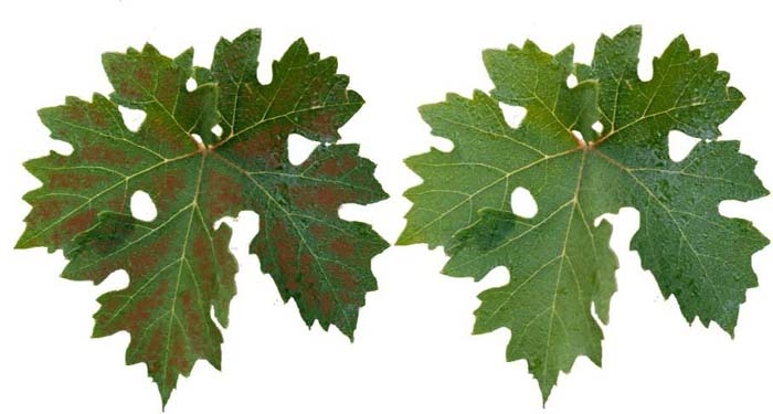 Feuilles : jaunissement marbré inter-nervaire (figure 9), les nervures apparaissant plus proéminentes. Grappes : plus petites présentant une maturité incomplète. |