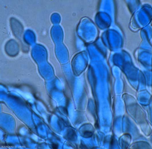 • Les conidies sont ovoïdes et leur taille peut varier selon la nature du support et les conditions environnementales (en moyenne : 10-13 X 7-14 µm). Elles se séparent les unes des autres par le sommet grâce à la formation de cloisons transversales à un niveau d'étranglement (arthrospores). Ces conidies sont en forme de tonnelet ovoïde chez M. fructigena.
