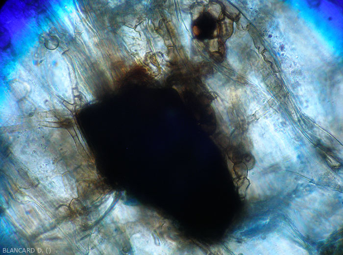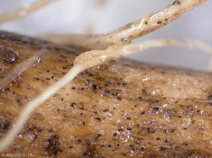 il produit des acervules intra- ou sous-épidermiques, matérialisant sa multiplication asexuée (figures 1 à 3)., ainsi que de nombreux sclérotes brun foncé à noirs.