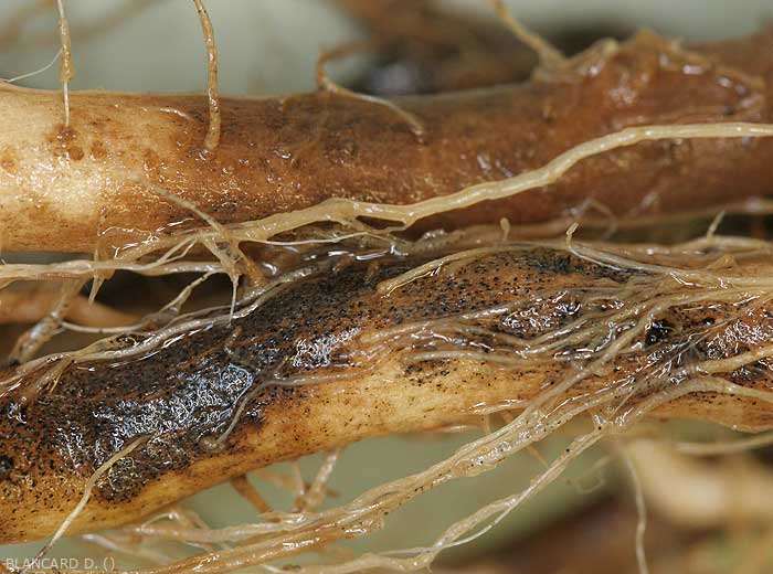 Lésions sur racines d'extension étendue, humides, brunes à noires, parfois superficiellement subérisées. Elles sont présentes en faible nombre sur les racines principales.