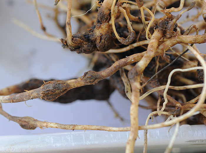 - Lésions sur radicelles, particulièrement sensibles, qui brunissent, se dégradent rapidement et disparaissent.