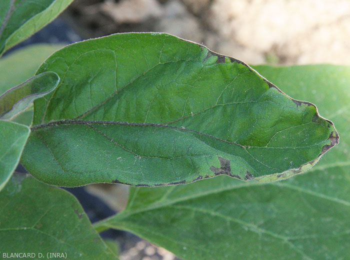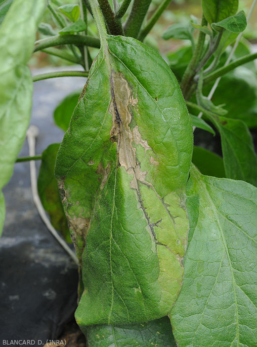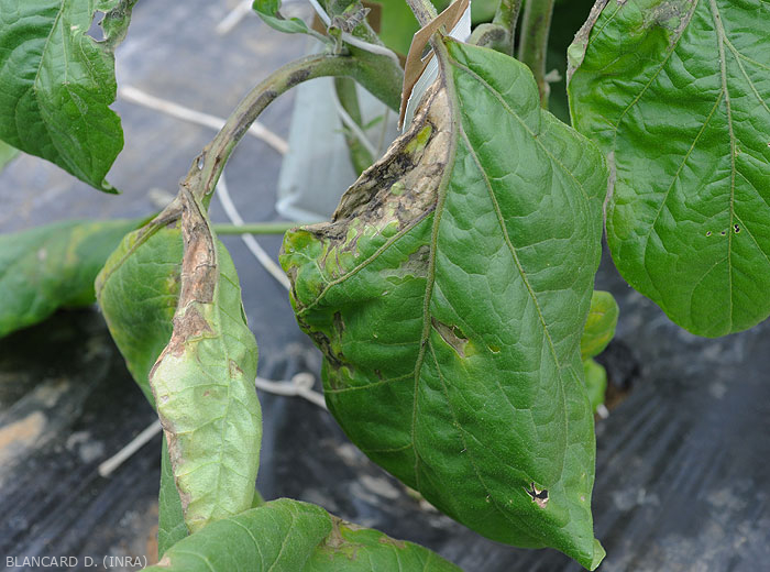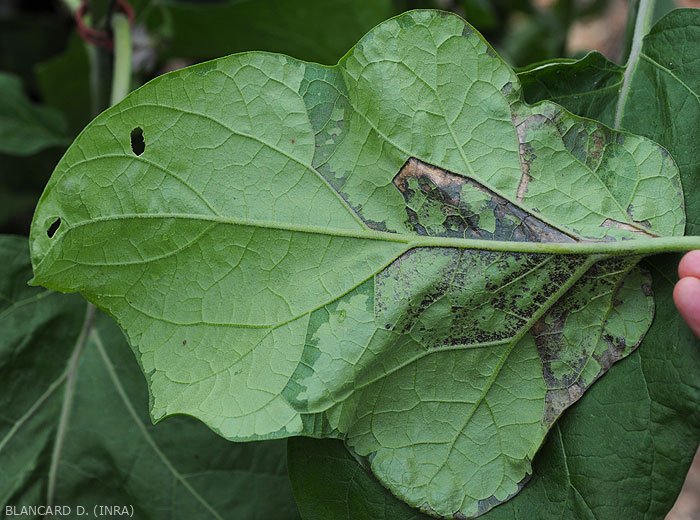 - Taches plus ou moins étendues sur feuilles, d'abord vitreuses et humides, noircissant rapidement, et pouvant altérer de larges secteurs du limbe qui finissent par se nécroser et se dessécher.