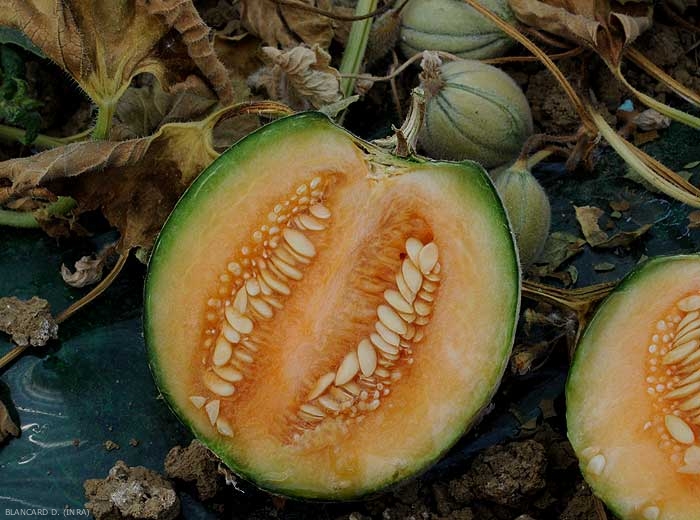 *Les symptômes foliaires peuvent varier en fonction de la souche de F. oxysporum f. sp. melonis et de la pression d'inoculum, du stade de développement de la plante (formation des fruits, nombre et/ou taille de ces derniers), et des conditions environnantes (manifestation de stress thermiques ou hydriques). Ils peuvent être observés séparément ou en même temps sur la même plante.