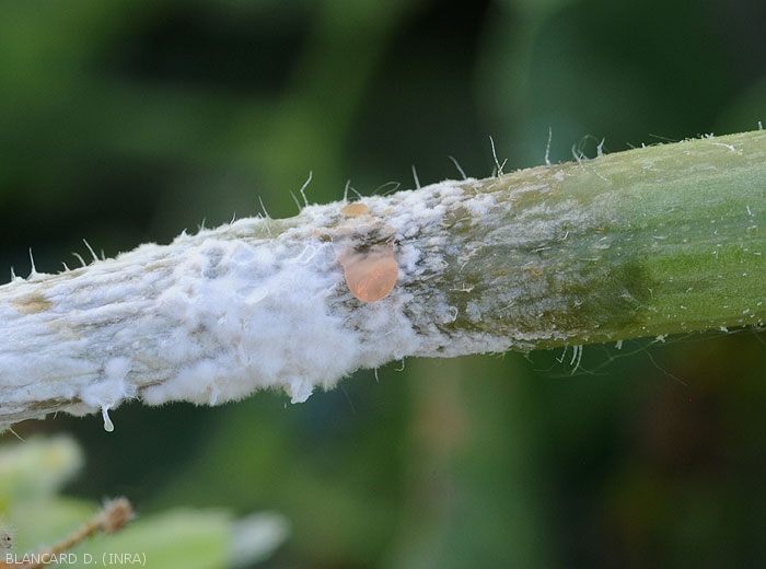 Il provoque des lésions allongées sur la tige s'initiant à partir de tissus sénescents ou blessés (fruits avortés, vrilles, pièces florales, feuilles senescentes...). Celles-ci peuvent être localisées à proximité du collet ou plus en hauteur sur la plante, notamment lorsque les melons sont palissés. Elles ont une apparence humide et sombre (figures 1 à 5), et elles finissent par la ceinturer sur plusieurs centimètres. Des exsudats gommeux bruns perlent parfois (figures 2 à 4). Notons que sur la partie distale du rameau ceinturé, les feuilles peuvent jaunir, flétrir et se dessécher.