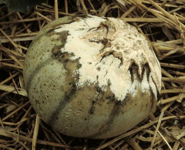 Les fruits affectés présentent une large lésion s'initiant au niveau des cicatrices pédonculaire (figures 1 et 2) ou stylaire (figure 3), sur le coté des fruits ou à partir d'une blessure comme un éclatement par exemple. Les tissus affectés prennent une teinte vert sombre dans un premier temps (figure 1), brunissent légèrement, tandis qu'une pourriture aigre se met en place progressivement.