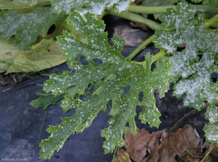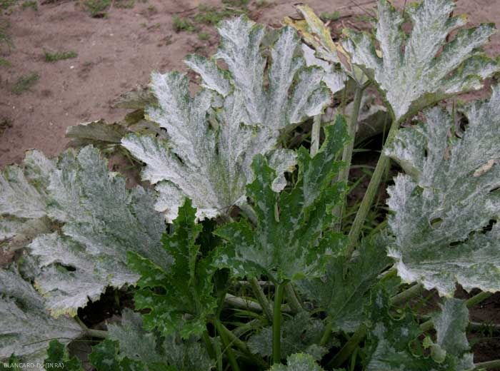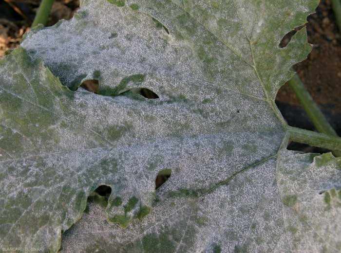 Podosphaera xanthii ou Golovinomyces cichoracearum var. cichoracearum sont à l'origine de taches poudreuses à duveteuses, circulaires et blanches, apparaissant sur ou sous les feuilles* (figures 1 à 3).