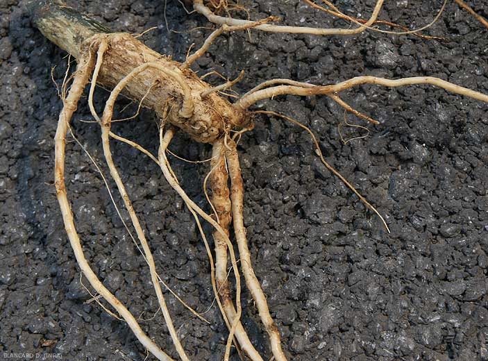 Après avoir arraché et lavé soigneusement les systèmes racinaires de quelques plantes malades, on constate qu'ils sont plus ou moins altérés (figures 1 à 4), pourris, localement subérisés. Des racines ont disparues et celles qui subsistent montrent des lésions nécrotiques brun rougeâtre plus ou moins étendues (figures 5 et 6), certains sont plus ou moins liégeuses (figure 3, 4 et 7). Les tissus racinaires finissent par pourrir et se décomposer, ce qui fait qu'à terme les systèmes racinaires sont très réduits.