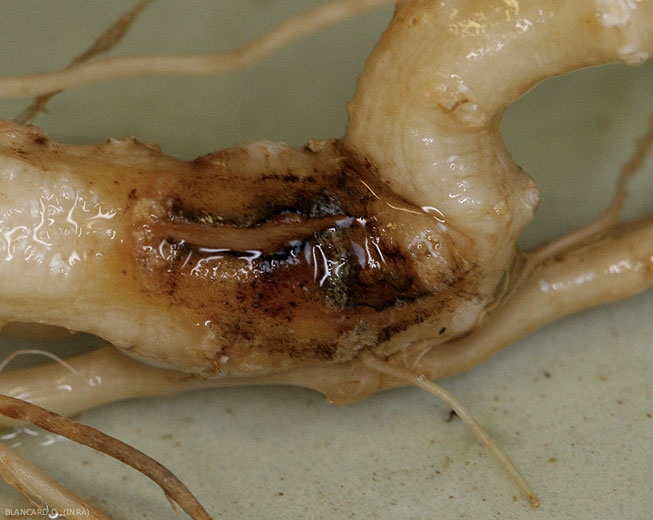 Sur les lésions racinaires, des lignes noires sont observées localement (pseudo-stromas) (figure 8), plus ou moins épaisses et aux contours irréguliers entourant des plages de tissus. Sur certaines portions, on discerne parfois plus difficilement de nombreuses ponctuations noir grisâtre à brun réparties en « mosaïque » en place dans les cellules du cortex. Ce sont les pseudo-microsclérotes (figures 9 et 10) de ce champignon.