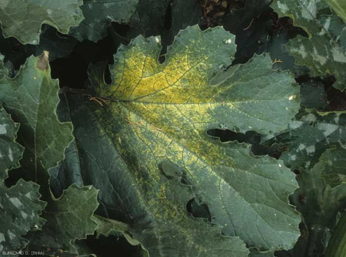 Dans certaines conditions encore mal définies, les vieilles feuilles de courgette présentent des plages jaunes diffuses débutant souvent à la base des nervures principales (figure 1). Cette altération de coloration n'est pas d'origine parasitaire ; elle semble irréversible mais sans conséquence sur la croissance et le rendement des plantes.