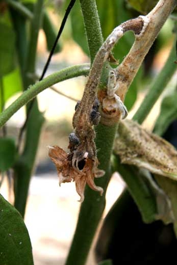Lésion humide, brunâtre ceinturant la tige sur plusieurs centimètres de ce pied d'aubergine.  Notez la présence de gros sclérotes noirs sur certains secteurs de tissus altérés. (<i>Sclerotinia sclerotiorum</i>)