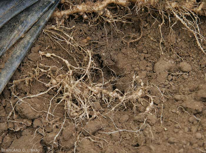 Dans les racines fortement attaquées par les <b><i>Meloidogyne</i> spp.</b>, il est assez aisé d'observer à la loupe binoculaire, et en dilacérant délicatement les tissus du cortex, des femelles hypertrophiées de couleur blanche (root-knot nematodes)