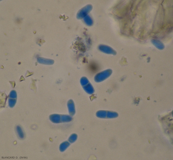 Détail de pycniospores  uni ou bicellulaires. <b><i>Didymella lycopersici</i></b> (chancre à <i>Didymella</i>, <i>Didymella</i> stem canker and fruit rot)