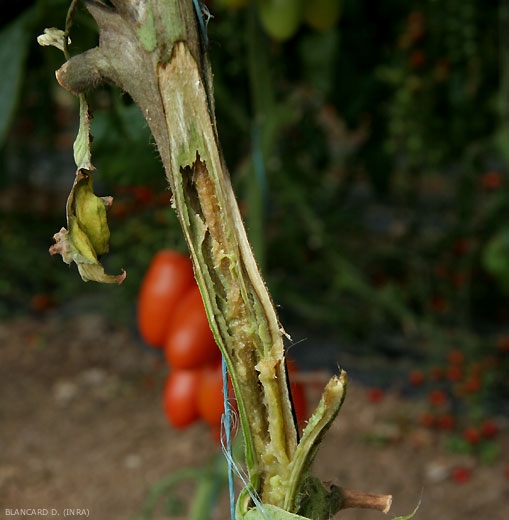 Une place brune, longitudinale, couvre partiellement cette tige de tomate. <b><i>Pectobacterium carotovorum</i></b>
