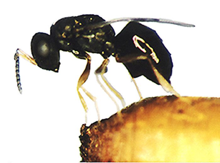Femelle de <b><i>Pachycrepoideus vindemmiae</i></b> parasitant la pupe de son hôte <b><i>Musca domestica</i></b>. Photo de Sonia Dourlot, Université de Rennes 1, publiée avec la permission de Dr AM Cortesero.