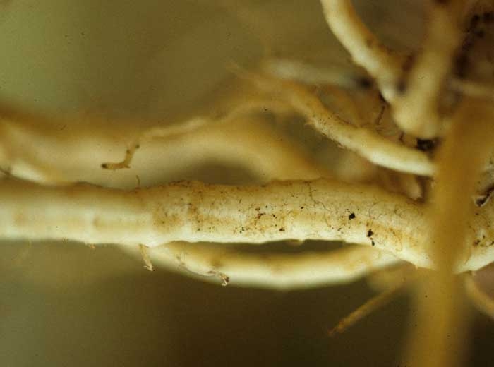 Des kystes de <i>Globodera</i> sp., ainsi que du mycélium brun de <i>Rhizoctonia solani</i> sont visibles sur ce système racinaire.