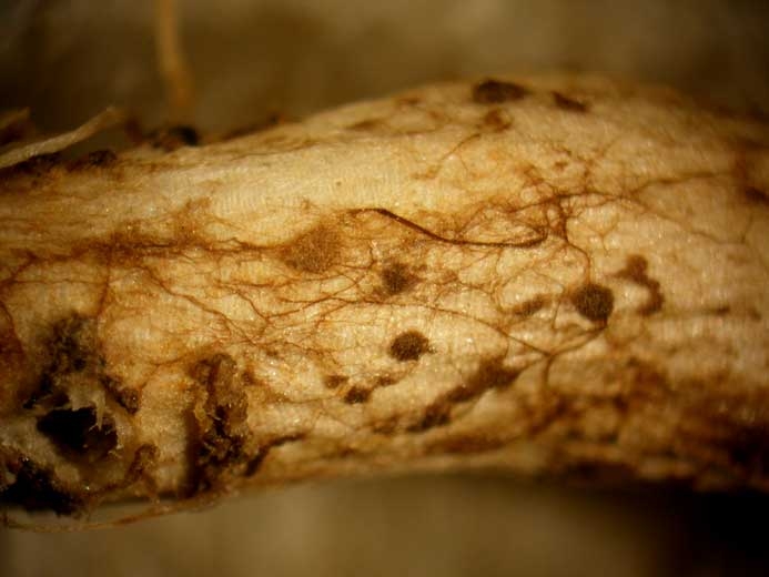 Les mycéliums brun et ramifié de <b><i>Rhizoctonia solani</i></b> sont bien visibles sur cette racine (damping-off, <i>Rhizoctonia</i> root rot, basal stem canker)