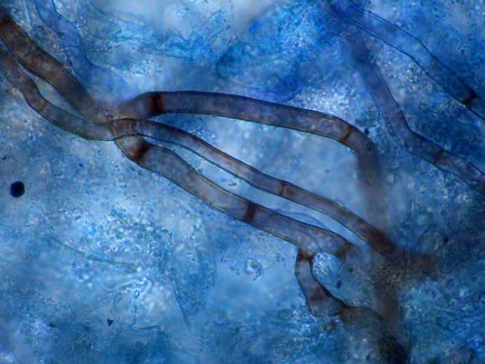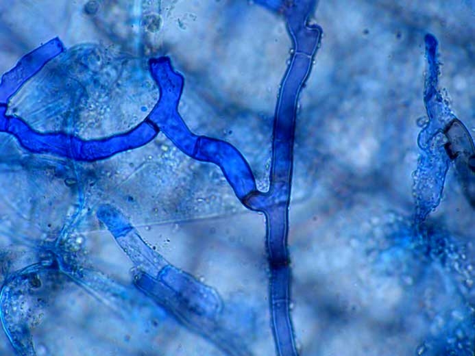 Le mycélium des champignons phytopathogènes tels que les ascomycètes et les basidiomycètes (ici <i>Rhizoctonia solani</i>), est <b>cloisonné</b>.