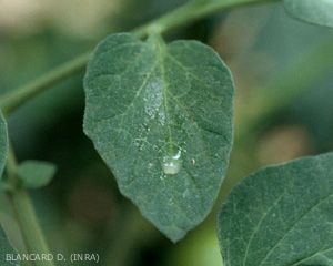Plusieurs jeunes lésions huileuses, plus ou moins allongées,  portent un exsudat brun. <b><i>Colletotrichum orbiculare</i></b> (anthracnose)