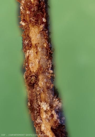<i>Hylobius abietis</i>, morsure de nutrition sur des branches basses de sapin.