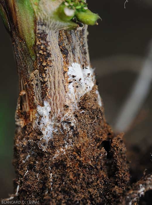 Filaments mycéliens plus ou moins agrégés  visibles sur ces tissus altérés.  (<i>Sclerotium rolfsii</i>)