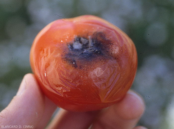 Une lésion débutante légèrement brunâtre s'est étendue à partir de la cicatrice pédonculaire de ce fruit. Elle est légèrement concave et la pellicule s'avère plus ou moins plissée. La présence de filaments mycéliens mélanisés et de pycnides noires explique la teinte sombre visible au centre de la lésion. <b><i>Didymella lycopercisi</i></b> (pourriture à <i>Didymella</i>, <i>Didymella</i> fruit rot)