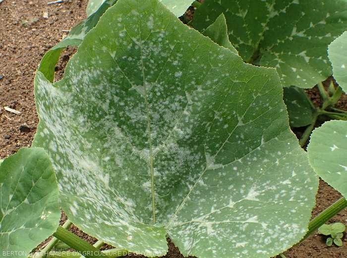 Sporulation blanche d'oïdium observée à la face inférieure d'une feuille de giraumon.  <i><b>Podosphaera xanthii</b></i> ou <i><b>Golovinomyces cichoracearum</b></i>.