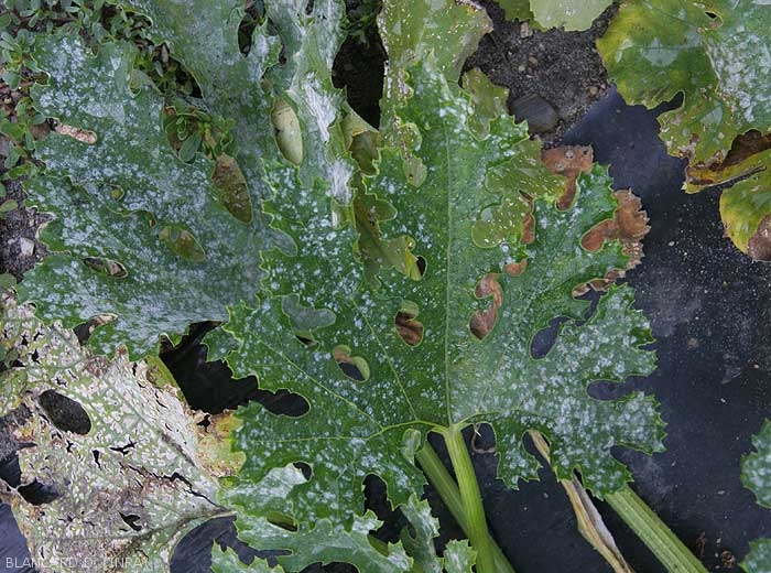 Symptômes d'oïdium sur feuille de courgette <i><b>Podosphaera xanthi</b></i>  ou <b><i>Golovinomyces cichoracearum</i> var. <i>cichoracearum</i></b> (oïdium ou blanc, powdery mildew, white mold)