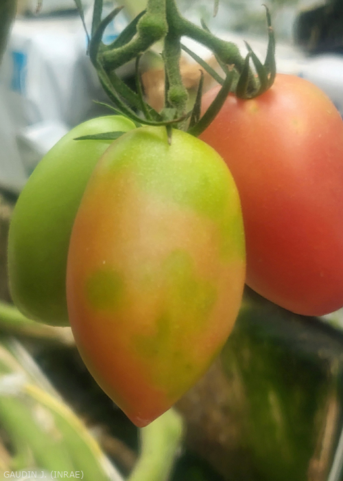 • Frutti : maturazione irregolare, macchie gialle o marroni, raramente si osserva la rugosità superficiale che dà il nome al virus; deformazioni e maturazione irregolare. Sintomi di scolorimento (Figure 3, 4 e 5) paragonabili a quelli causati da TMV , ToMV , TSWV , PepMV e PhCMoV. L'intensità dei sintomi può variare a seconda della varietà di pomodoro.