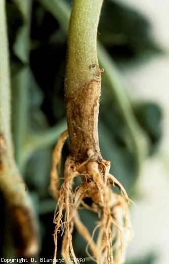 Soulignons que le collet, partie de la tige située au niveau du sol, est particulièrement vulnérable, notamment au stress hydrique et à quelques champignons « spécialisés » comme Sclerotium rolfsii. Ainsi des altérations plus ou moins étendues, ceinturant parfois totalement la tige, caractérisent-elles un problème au collet. Dans bien des cas, les flux de sèves seront perturbés, entraînant des jaunissements et/ou des flétrissements plus ou moins réversibles.