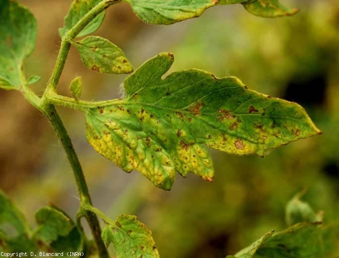 | Alfalfa mosaic virus (AMV) | Taches, altérations nécrotiques s'initiant à la base des folioles, se généralisant au limbe (figure 1) (consulter le thème Flétrissement, nécrose des feuilles). Les nervures sont parfois elles-mêmes nécrosées. Ces altérations gagnent la tige, s'étendent sur plusieurs centimètres, et affectent l'apex. Une mosaïque jaune de type aucuba peut aussi être constatée sur foliole de tomate dans certains contextes. Des lésions nécrotiques brunes plus ou moins marquées sont visibles sur les fruits, qui peuvent être bosselés. |